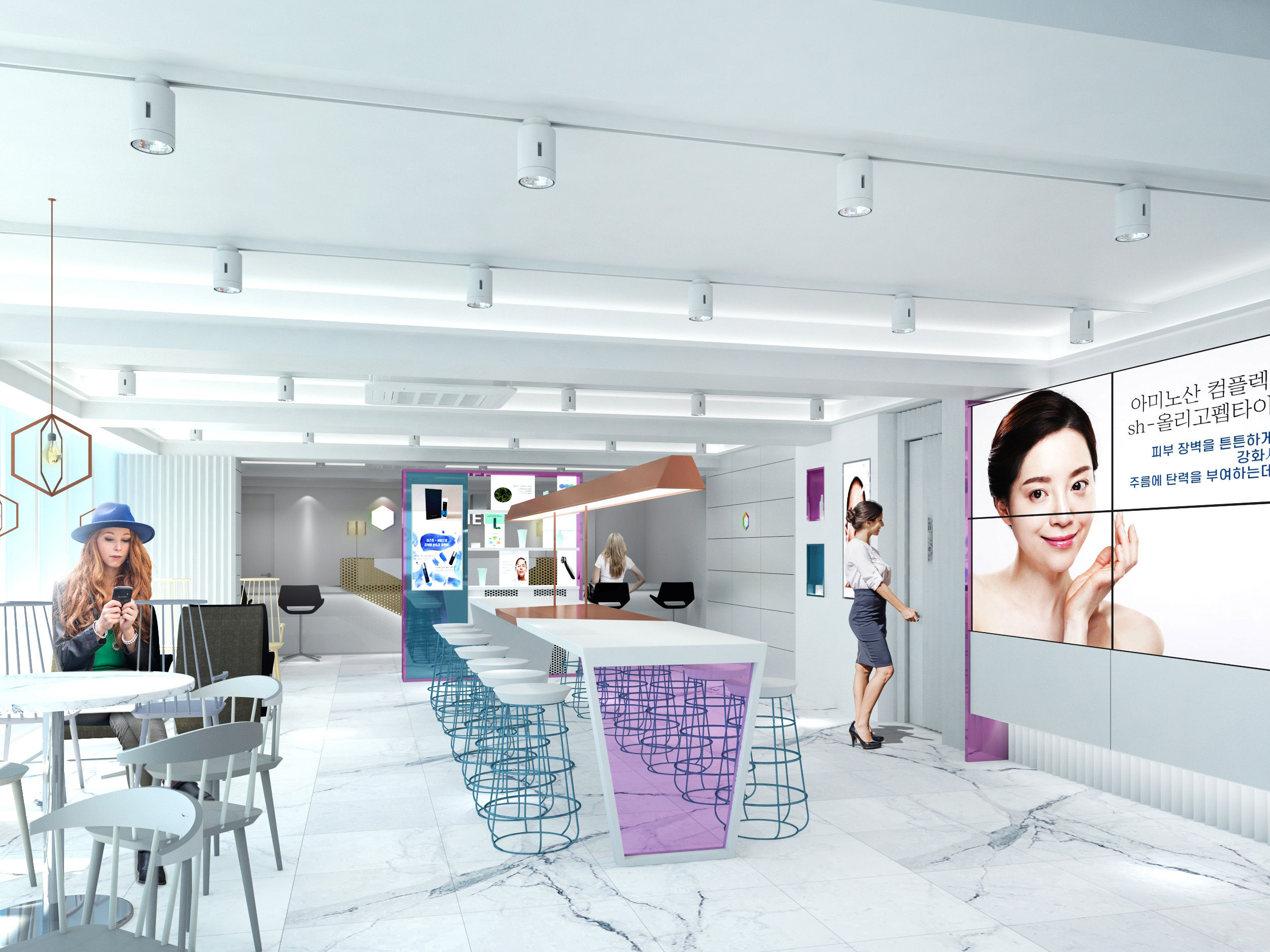 입구에 카운터를 위치해 두었고 각 공간은 디스플레이존으로 분리하여 이용객들이 이동하는 동안 자연스럽게 제품의 정보가 노출된다. 화이트 톤을 주된 컬러로 하면서 제품이나 강조해야 할 부분에 적재적소로 포인트 컬러를 사용해 이용 고객들에게 자연스러운 정보 전달과 시각적 다양성을 준다.