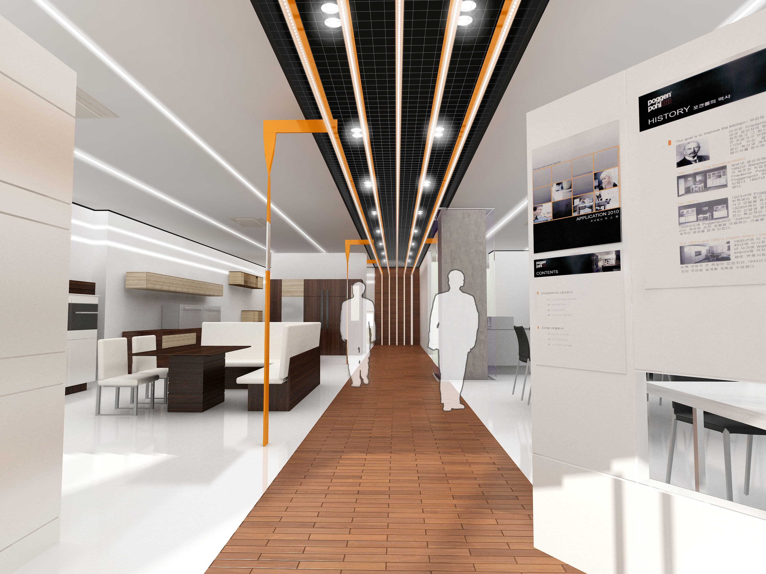 파사드부터 들어오는 주황색 루버는 전시장 한가운데를 통과해 중앙 동선을 비추는 조명이자 이 전시장의 포인트가 되는 조형물이 된다.